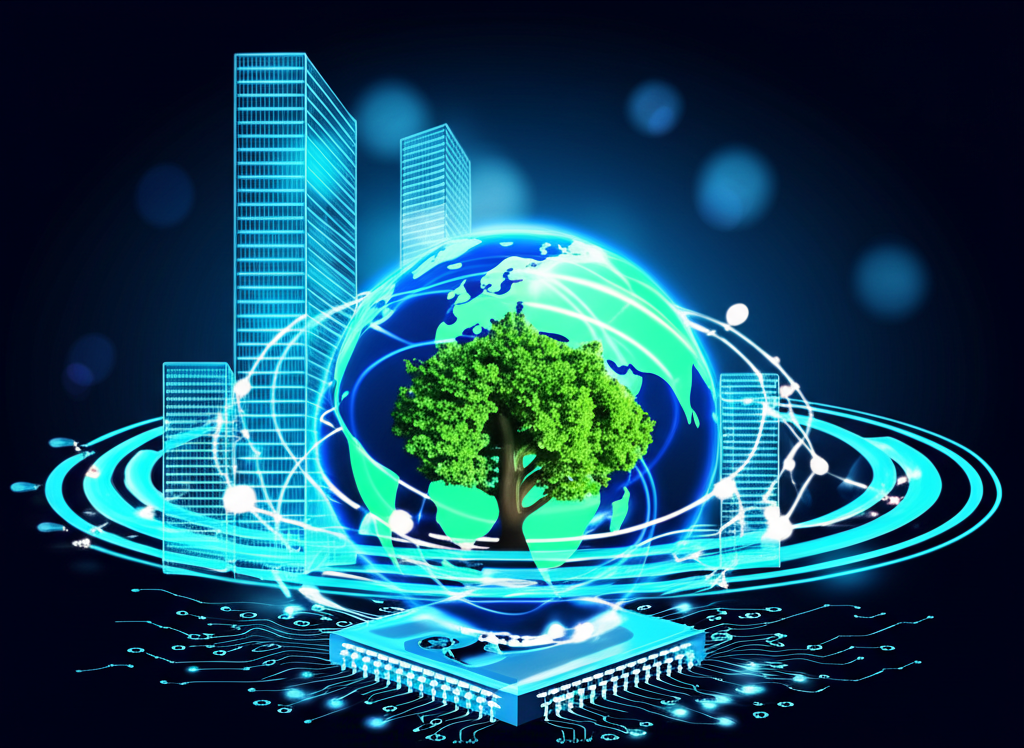 全球數位轉型與永續發展插圖,電路板上生長的樹木象徵綠色科技解決方案