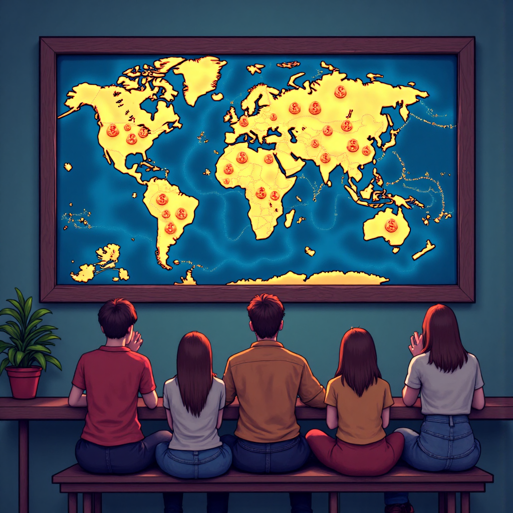 新手外匯交易者觀看世界地圖與貨幣符號的像素藝術插圖,描繪一群初學者跟隨指引探索全球市場