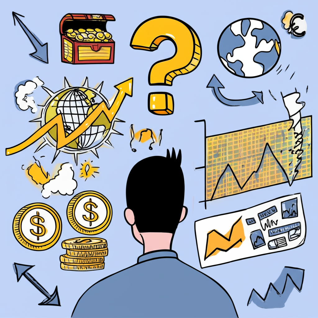 投資者困惑地注視金價波動圖表,周圍環繞財富象徵與全球經濟不穩元素