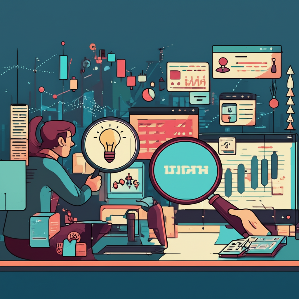 投資人觀察股票市場波動圖表,放大鏡聚焦公司銷售數據,背景為成長中的企業象徵市值營收比的啟發時刻